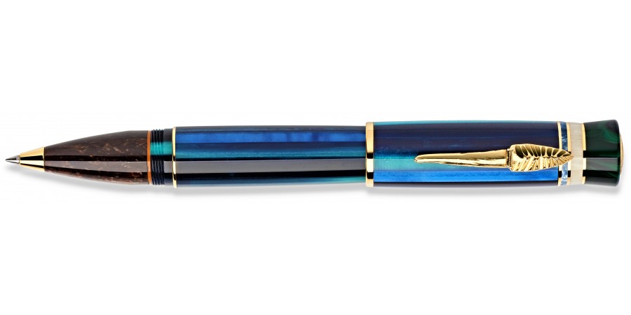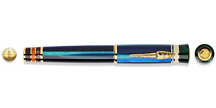 Realizzata artigianalmente in tutta la sua complessità, Delta Sentinelesi è un opera composta da innumerevoli parti che si differenziano per materiali, colori e finiture; tutto tornito a mano da barre piene; i colori riprendono le visioni dei luoghi: cielo, mare, terra, foresta, ovvero tutto ciò che l’occhio umano può scorgere avvicinandosi all’isola di North Sentinel. La clip si ispira all’arma rudimentale con la quale gli uomini del popolo usano cacciare. Le minuterie metalliche sono impreziosite da consistenti placcature in oro a 24 carati. Meccanismo di riempimento di inchiostro a stantuffo fisso costruito nelle nostre officine. La stilografica è dotata di pennino in oro massiccio a 14 carati ed è disponibile nelle gradazioni di tratto scrittura extra fine, fine, medio, broad, stub 1.1, flex extra fine e fine, e reca incisa a rilievo la conformazione geografica dell’isola. Il roller, identico alla penna stilografica è dotato di refill di grande capacità di inchiostro.