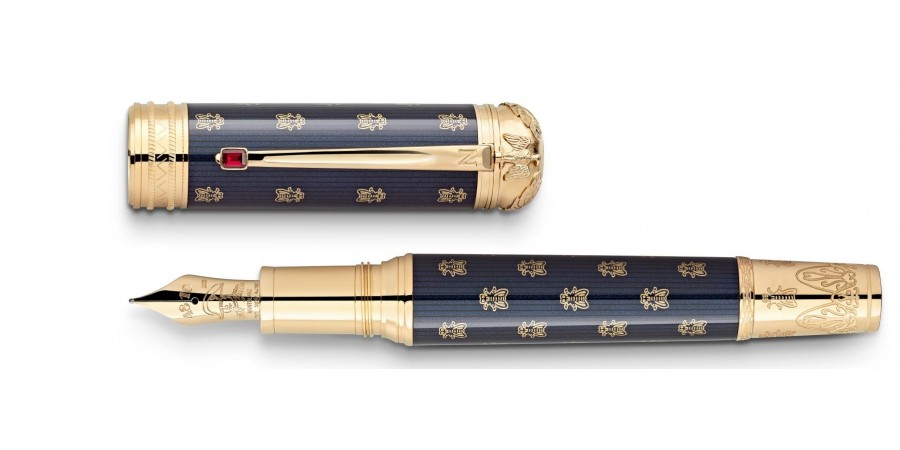 La Montblanc Patron of Art Homage to Napoléon Bonaparte è dedicata a un personaggio storico, la cui esistenza ha avuto un impatto di vasta portata. La gloria di Napoleone rivive nello stile “architecture parlante” dei celebri palazzi parigini realizzati durante il suo regno. Oltre all’architettura, sotto la sua guida sono fioriti anche altri settori come la pittura, la scultura e le arti decorative. Il design si ispira allo stile neoclassico. Il motivo con api in oro su lacca blu scuro è ispirato al trono napoleonico a Fontainebleau, mentre la clip a forma di spada riporta la “N” di Napoleone. L’incisione sulla parte superiore del cappuccio - una corona di alloro, una corona imperiale e un’aquila - riprende l’emblema dell’incoronazione di Napoleone. Il cappuccio è coronato dall’emblema Montblanc in pregiata resina. L’estremità della clip è decorata da una gemma rossa che riprende l’anello dell’incoronazione di Giuseppina, moglie di Napoleone. In omaggio a Napoleone Bonaparte, il pennino realizzato in oro massiccio Au 750 presenta un ritratto di Napoleone con il tipico bicorno.