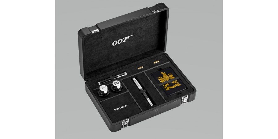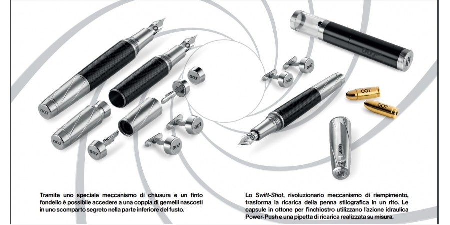 - La custodia personalizzata è equipaggiata con scomparti segreti e un taccuino. Oltre agli accessori Swift-Shot, le penne stilografiche vengono fornite con due flaconi di inchiostro a marchio 007