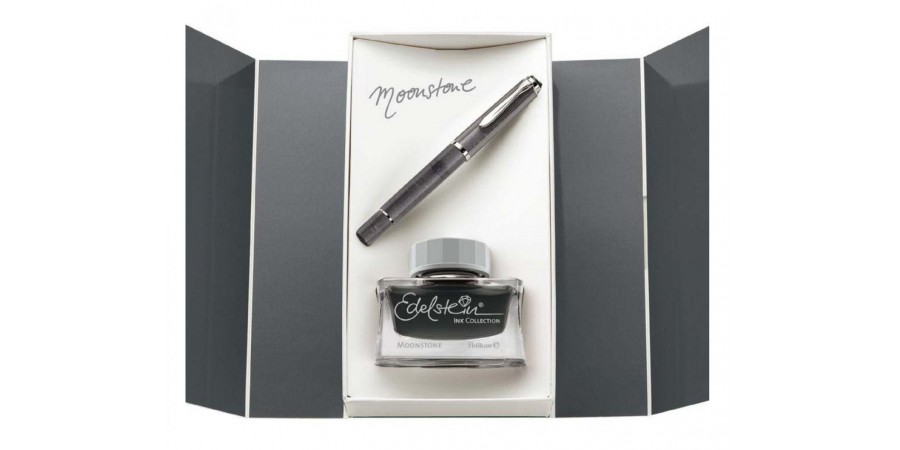 La gamma è infine impreziosita da un elegante set regalo che comprende stilografica e il flacone Edelstein Ink of Year 2020 Moonstone.