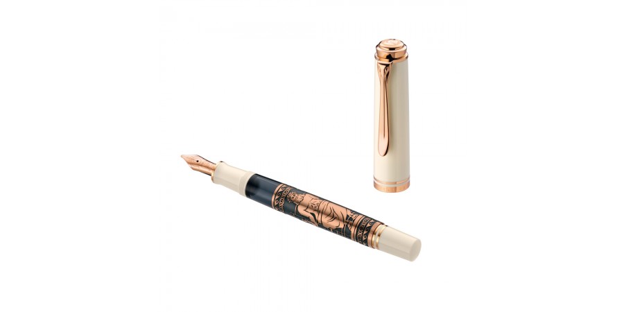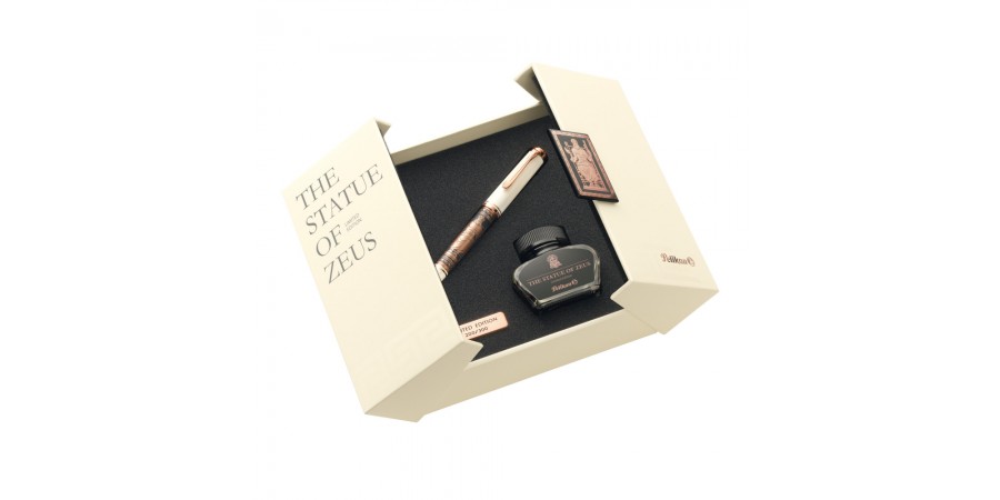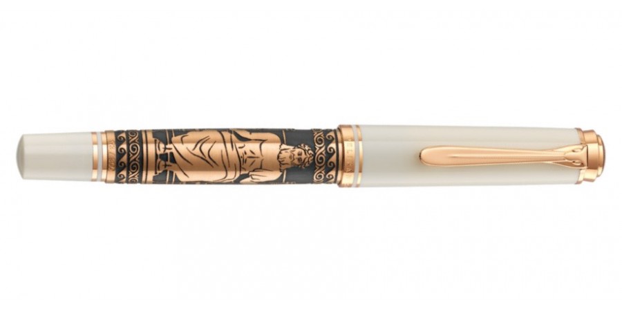La Pelikan M740 The Statue of Zeus, con il motivo sul fusto realizzato in argento 925 placcato in oro rosa 18kt e pennino in oro rosa. La decorazione sul corpo riprende la statua di Zeus scolpita da Fidia nel Tempio Olimpia.