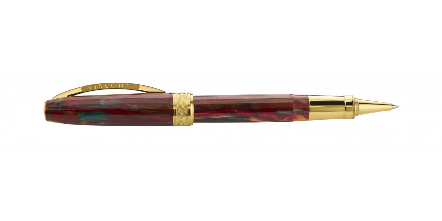 La penna Visconti Flowering plum orchard è realizzata con finiture placcate oro giallo che aggiungono luce alla resina acrilica rossa, verde e marrone.