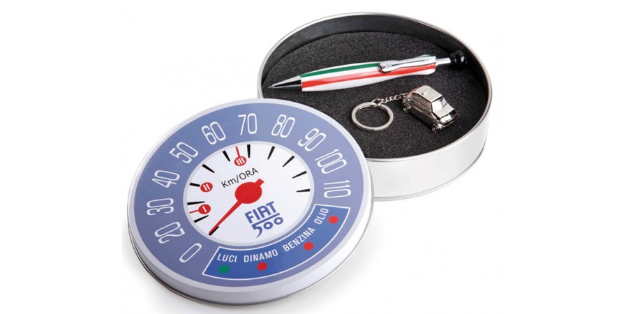 Confezione contenente penna Fiat 500 Tricolore e portachiavi.