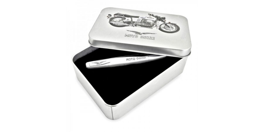 Penna Moto Guzzi in acciaio lucido cromato. La forma della penna richiama l'inconfondibile design del tubo di scappamento Moto Guzzi.