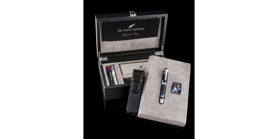 Ogni penna viene consegnata all’interno di una scatola da scrivania di grande formato contenente un set di cartucce compatibili, una pezza di seta per la pulizia ed una pochette da viaggio in cuoio. Lo strumento è accompagnato da un frammento grezzo della pietra utilizzata per la decorazione.